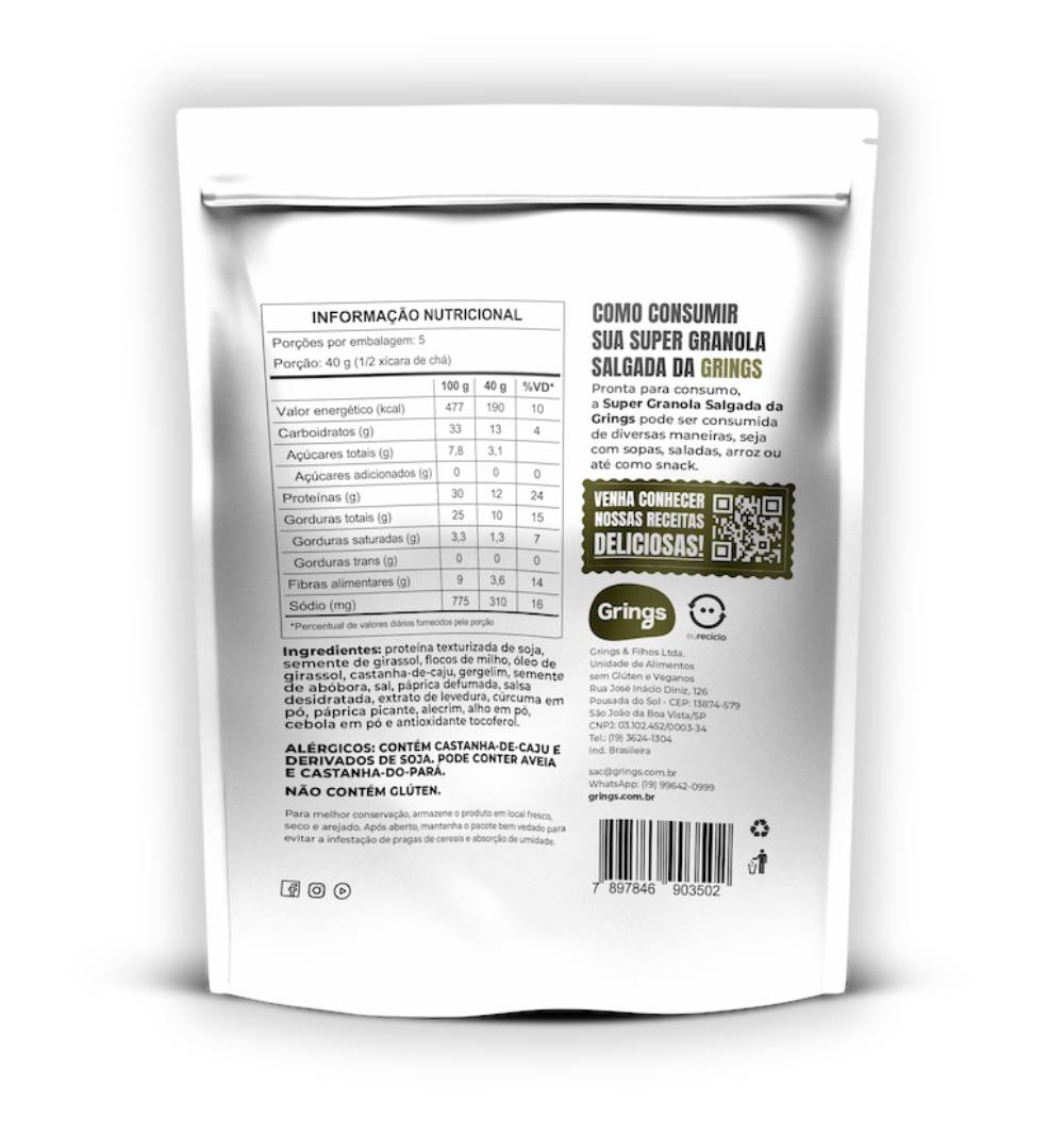 A Granola Salgada da Grings é sem glúten, sem lactose, vegana e sem transgênicos. A proteína de soja faz dela fonte de proteína, que ajudam no controle hormonal, na prevenção de diabetes e alguns tipos de câncer. Por conter castanha de caju é um alimento rico em antioxidantes e ferro, ajuda na prevenção da anemia, além de melhorar a saúde da pele, unhas e cabelo. Possui Ômega 3, presente na semente de abóbora, o que ajuda no funcionamento do cérebro, coração e diminui a inflamação do organismo. Possui gorduras boas presentes na semente de girassol, que ajudam a prevenir doenças cardiovasculares, como pressão alta ou infarto, além de ainda ajudar na perda de peso.